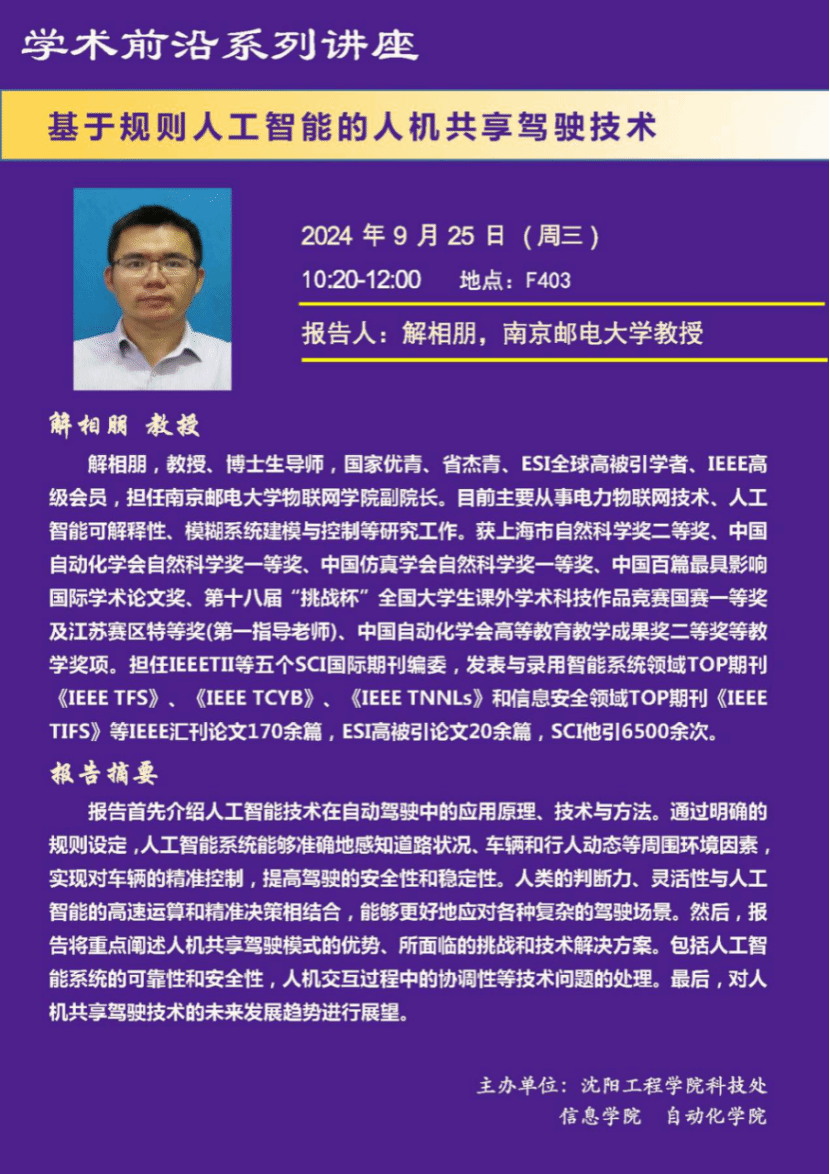 2024年9月25日上午,南京邮电大学物联网学院副院长、人工智能专家解相朋教授应邀来到我校,开展了一场题为“基于规则人工智能的人机共享驾驶技术”的学术讲座。本次讲座由学校科技处、信息学院、伟德betvlctor1946等联合举办,吸引了众多师生前来参加。解相朋教授在人工智能、物联网以及智能控制领域拥有丰富的研究经验,其深厚的学术造诣和多项科研成果使得此次讲座备受期待。