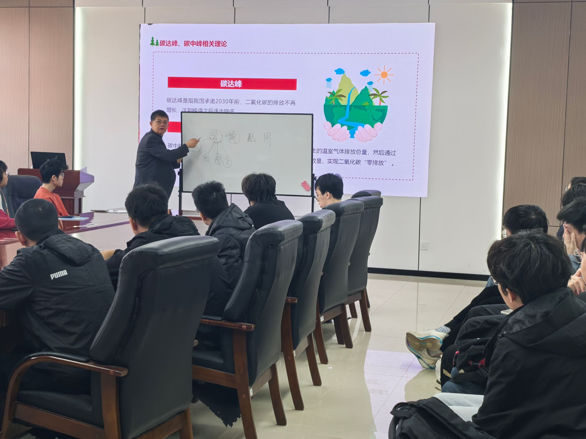 尹常永院长系统阐述了在面对全球恶劣气候问题的背景下,中国向世界做出“碳达峰、碳中和”承诺,承诺在2030年前实现二氧化碳排量达到峰值,之后逐步降低;企业、团体或个人可通过测算在一定时间内直接或间接产生的温室气体排放总量,通过植物造树造林、节能减排等形式,抵消自身产生的二氧化碳排放量,实现二氧化碳“碳中和”。同时,带着学生回顾了自“双碳”目标提出以来,我们国家如何统筹有序做好碳达峰、碳中和工作,协同推进降碳、减污、扩绿、增长,积极应对气候变化,完善生态文明基础体制,健全生态环境治理体系,完善绿色低碳发展机制。