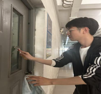赵传钰老师带领学生干部清理门窗污渍