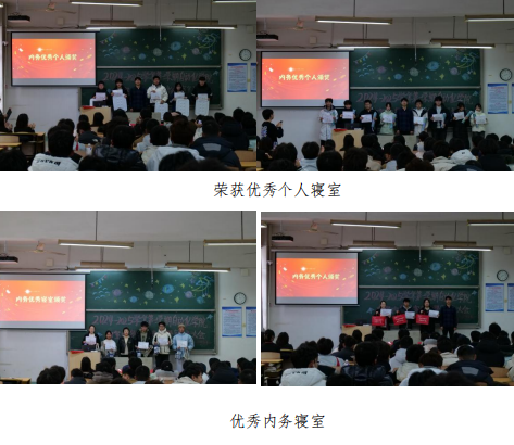 经过层层筛选,荣获内务优秀个人一等奖 3 人、二等奖 5 人、三等奖 8 人、优秀奖 13 人。内务优秀寝室一等奖 3 个、二等奖 5 个、三等奖 5 个、优秀奖 8 个。分别由赵传钰老师、高璇老师颁奖,鼓励获奖同学再接再厉,在寝室中发挥模范作用,激励寝室成员积极做好内务。