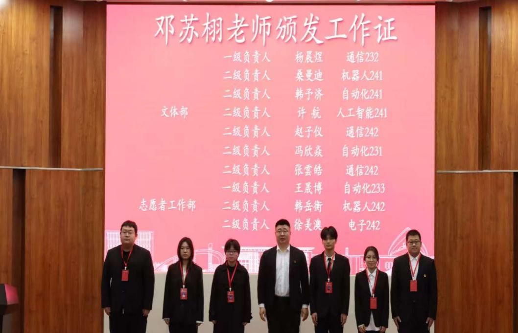 会议随后举行学生干部聘任仪式。邓苏栩宣读《伟德betvlctor1946 2025 年学生干部聘用决定》,张海燕、邓苏栩、高璇、许文利、尹思佳、杨乘一等老师为新一届学生干部颁发工作证。学生干部代表魏广超发言表示,将恪尽职守、锐意进取,不负老师与同学的重托。随后,在学生干部刘雨泽的带领下,全体学生干部起立宣誓,“服务,团结,创新,奉献” 的铮铮誓言响彻报告厅,彰显了为学院发展贡献力量的坚定决心。