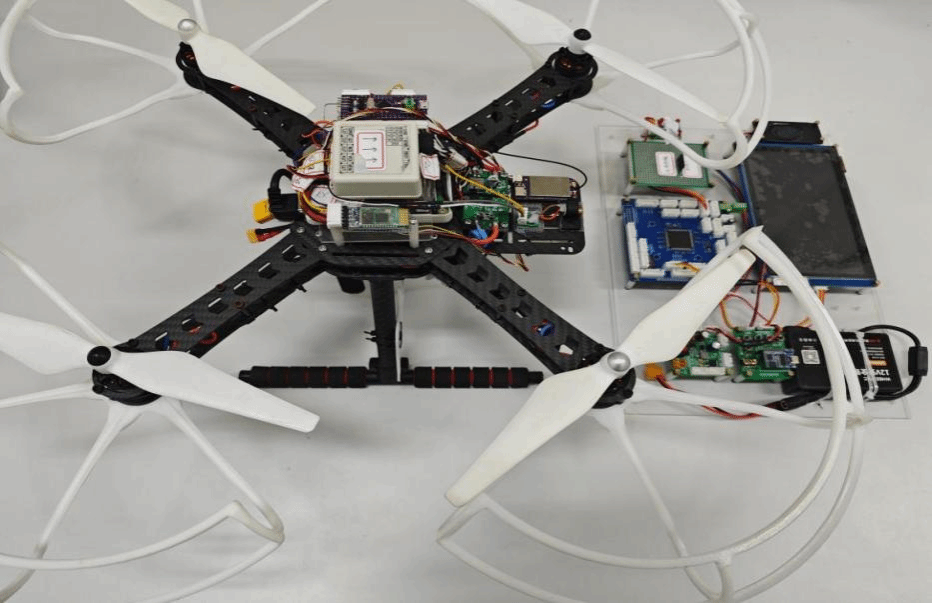 该作品以STM32F407VET6芯片作为无人机主控核心,结合Raspberry Pi作为视觉处理模块,系统还配备了光流模块,蓝牙模块,激光模块,超声波模块。地面站采用STM32最小系统配合LCD电容触摸屏实现结果显示。无人机从起点垂直起飞,按预定路径对货架A至D面的货物进行盘点,识别二维码后,激光打在二维码区域,并通过蓝牙发送信息到地面站,显示货物编号和坐标信息。地面站指示路径查找目标货物后返回编号和坐标信息,最后稳定降落在指定区域内。