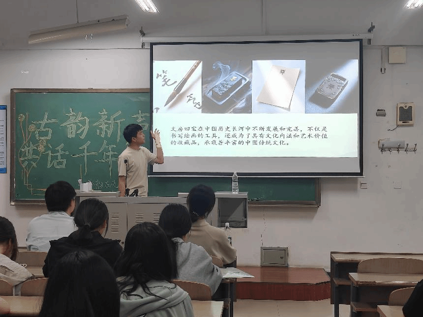 5月24日,F103教室内,30余名学生侧耳倾听台上演讲人分享传统文化知识。这是华韵古风社团在举行文化科普讲堂活动,旨在弘扬中华优秀传统文化,增强学生文化自信,同时为热爱传统文化的同学提供一个舞台,通过演讲、互动、展示等形式,让参与者感受传统文化的深厚底蕴与现代活力。
