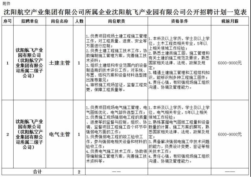 附件:沈阳航空产业集团有限公司所属企业沈阳航飞产业园有限公司公开招聘计划一览表(见下图)