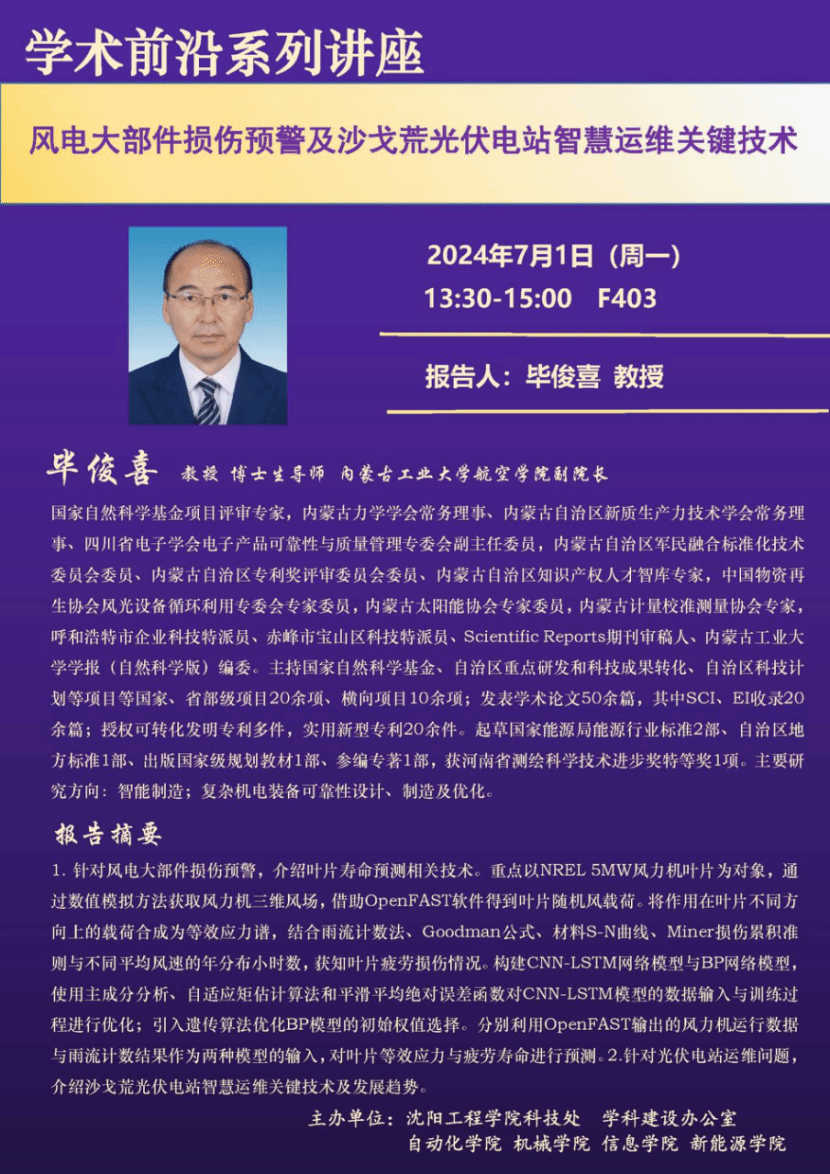 2024年7月1日下午,内蒙古工业大学航空学院副院长、博士生导师毕俊喜教授应邀来我校进行了一场以“风电大部件损伤预警及沙戈荒光伏电站智慧运维关键技术”为主题的学术讲座,本次讲座由学校科技处、伟德betvlctor1946等联合举办。