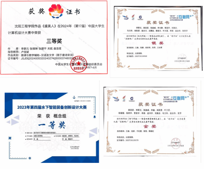 在校期间积极参与学科竞赛,目前累计2024年(第17届)中国大学生计算机设计大赛三等奖、2024年“挑战杯”辽宁省大学生创业计划竞赛省级金奖、“建行杯”辽宁省第九届“互联网+”大学生创新创业竞赛银奖、2023年第四届水下智能装备创新设计大赛省级一等奖、等各类各级竞赛奖项20余项,也多次参加省级决赛项目路演及创业展示活动。